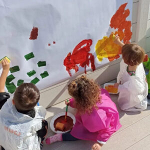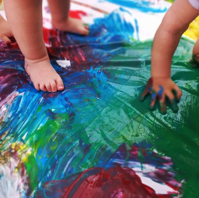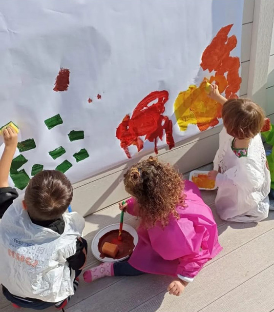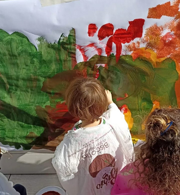 Pittura: grandi fogli appesi ai muri, grandi pennelli, tappi di sughero, spugnette, o con il semplice uso delle mani, i bambini sono liberi di esprimere la loro fantasia e creatività.